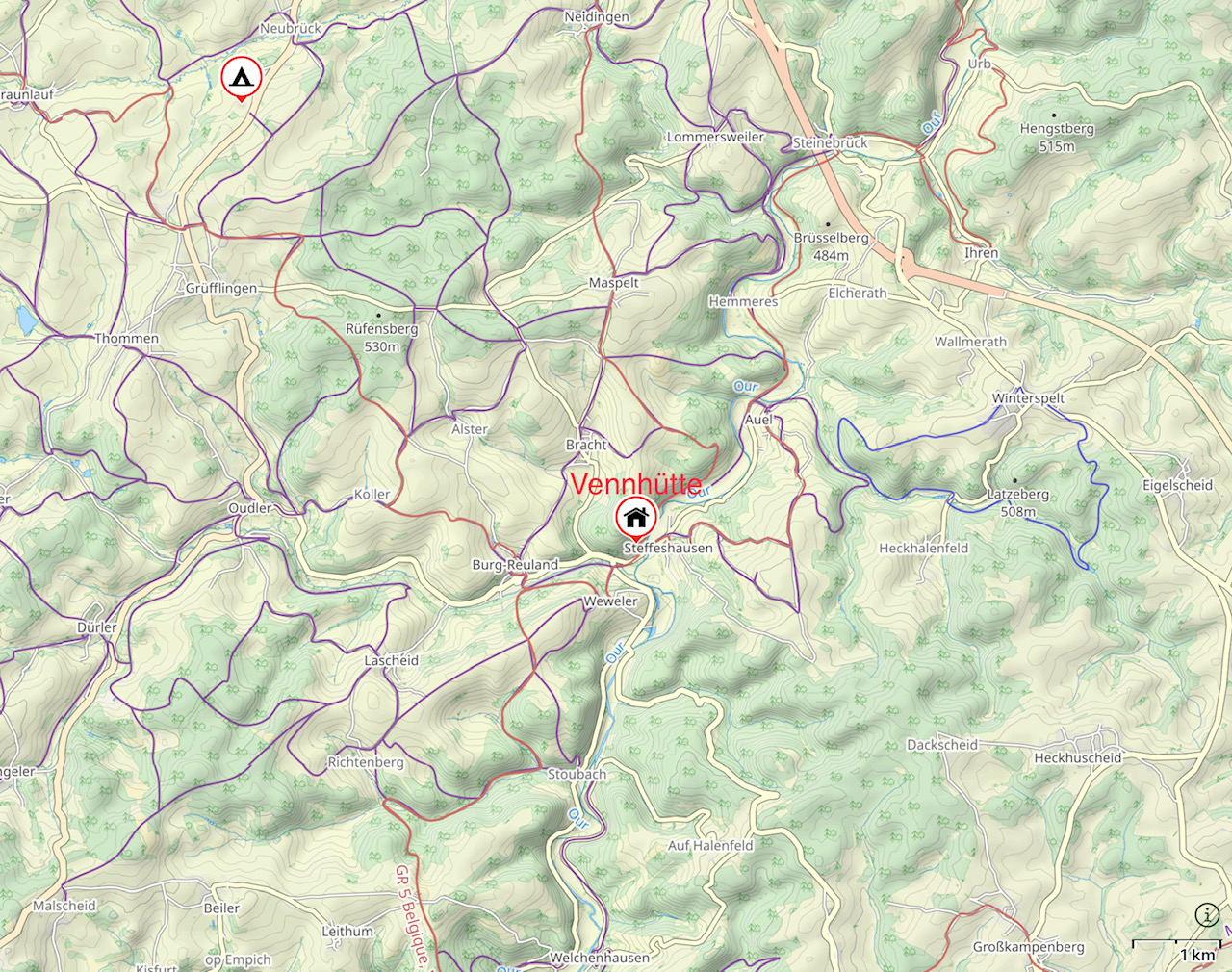 - Start- en eindpunt: de Vennhütte, Am Bahnhof 13, 4790 Burg Reuland - telefoon (België) 080 418 826. Coördinaten: 50.1985790, 6.1529667 - Google Maps. Bekijk de site of het informatieblad van de NKBV (pdf).
