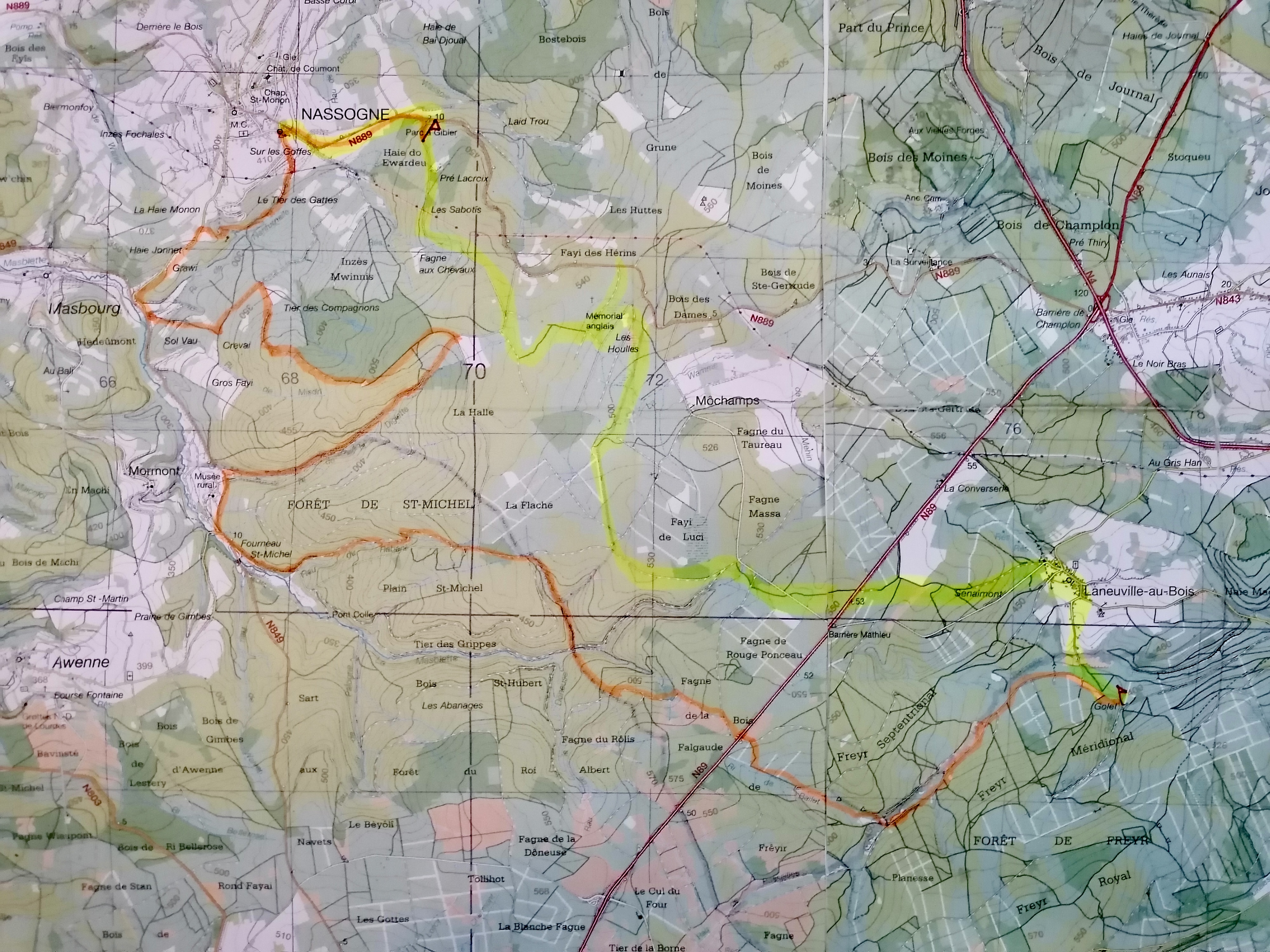 Zaterdag lopen we een deel van de transardennaise richting Bivouac du Golet. Op onderstaande kaart is dit de oranje route, die circa 25-30 kilometer lang is en eventueel is in te korten door de auto te verzetten of af te steken.