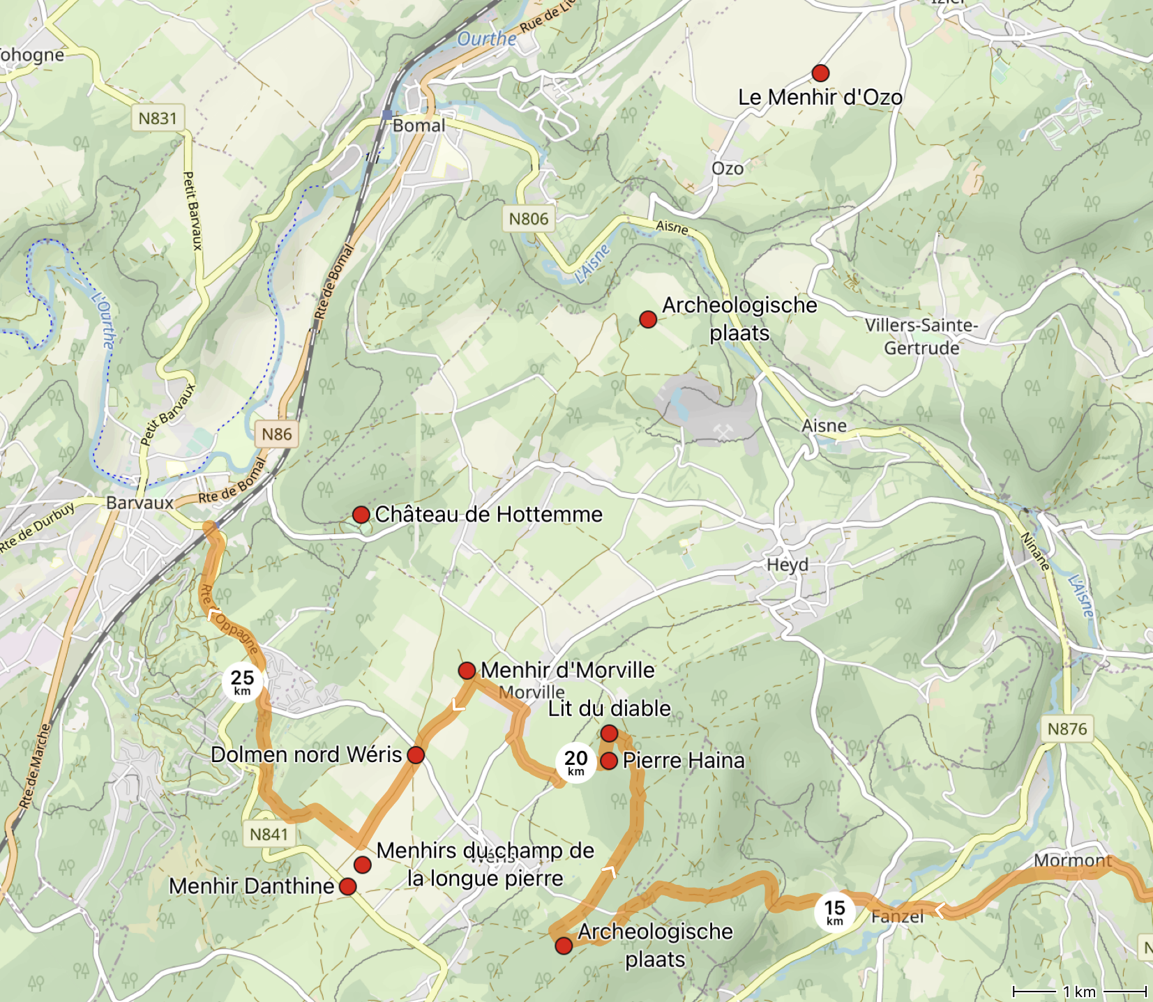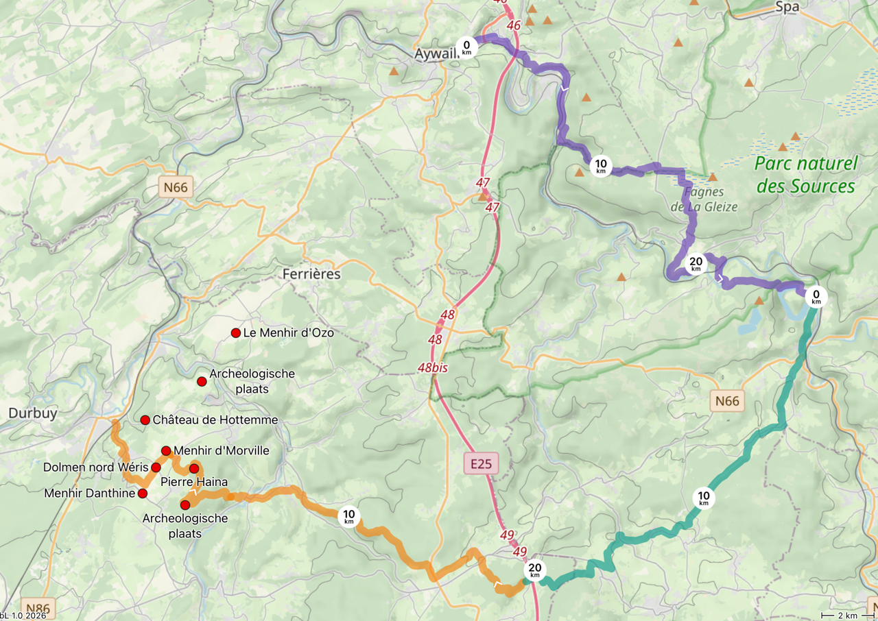 Koningsdag maandag 27 april trekken we vanaf de camping westwaarts en pikken we delen van de GR 57 op. We komen onder andere door het fraaie dorpje Wéris bekend om zijn prehistorische dolmens. In Barvaux pakken we de trein die elke 6 minuten voor het uur vertrekt naar het beginpunt Aywaille. De treinreis duurt 45 minuten. De afstand is circa 26,5 kilometer langs de archeologische punten (inkortbaar tot circa 24 kilometer), 440 m stijging en 710 m daling