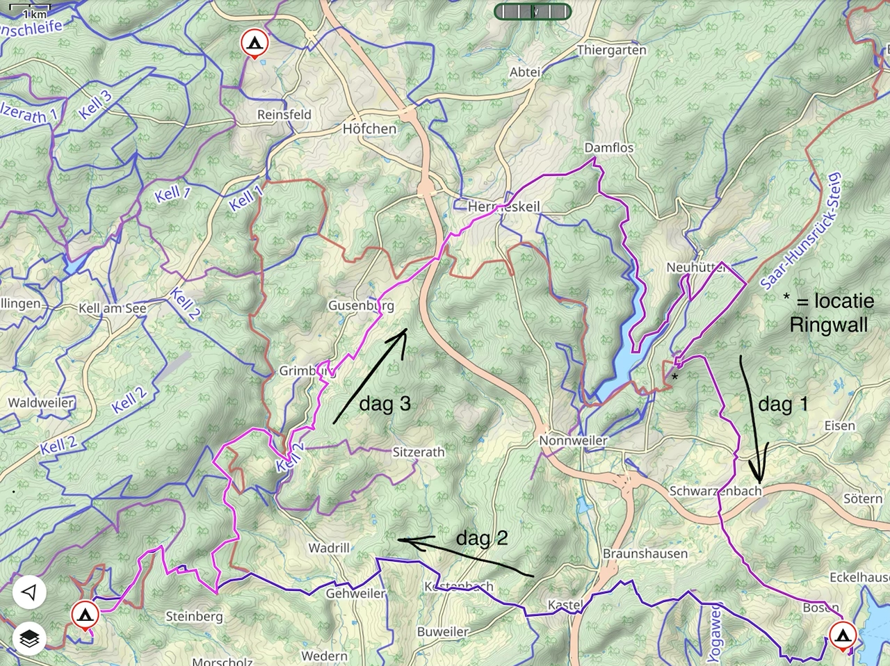 De 1e dag verzetten we de auto’s naar Hermeskeil. Hiervandaan gaan we lopen over delen van de Saar-Hunsrucksteig via Nonnweiler en de fraaie Keltenwall naar Bostalsee. We komen langs de zeer bezienswaardige Keltische Ringwall. Het routevoorstel is 27 kilometer lang, maar desgewenst kan worden ingekort tot plm. 24 kilometer.