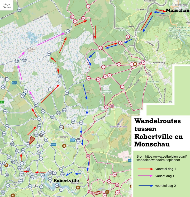 Onderstaand de voorgestelde route op de wandelknooppuntenkaart met een variant voor de eerste dag
