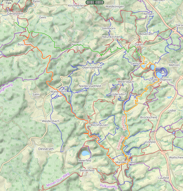 Vrijdag 20 februari lopen van Gerolstein naar Manderscheid. Dit is een relatief lange wandeling die grotendeels door het bos gaat. Deels langs de rivieren maar ook over de heuvels heen. We komen o.a. door Wallenborn waar we mogelijk een koffiepauze kunnen houden. De hoogteverschillen zijn ca. 620 m. klimmen en 680 m. dalen. Overnachten in de jeugdherberg te Manderscheid.