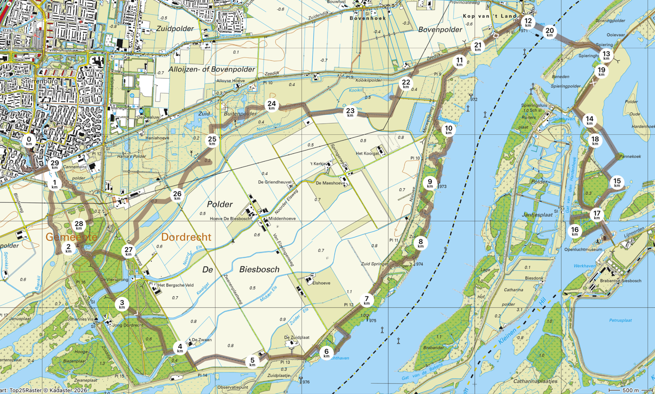 De track is inclusief circa drie kilometer veerpont-kilometers vanuit Kop van het Land naar de 'Brabantse overkant' en terug, dus netto 26,5 kilometer lopen. Door de lus naar de Brabantse kant over te slaan kan de wandeling worden ingekort tot 21 kilometer.