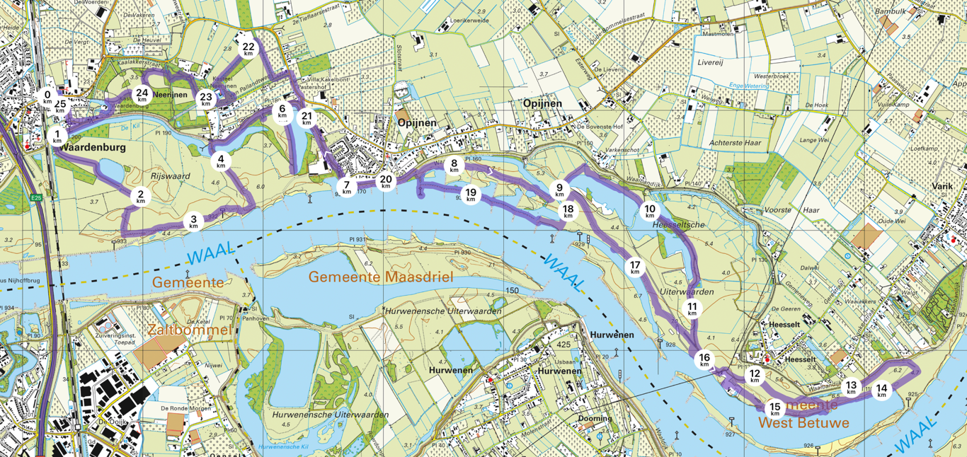 De dijkversterking met de voor alle verkeer afgesloten Waaldijk tussen Varik en Opijnen geeft misschien een stukje omweg bij Opijnen. De molen bij Waardenburg wordt in april 10 cm omhoog gevijzeld, maar dat zal in mei toch wel klaar zijn. De meeste paden gaan door de uiterwaard, dus wij vermoeden dat we er als wandelaar wel langs kunnen, desnoods met extra ommetje Opijnen. De cafetaria van Opijnen laat op website niks merken van een probleem.