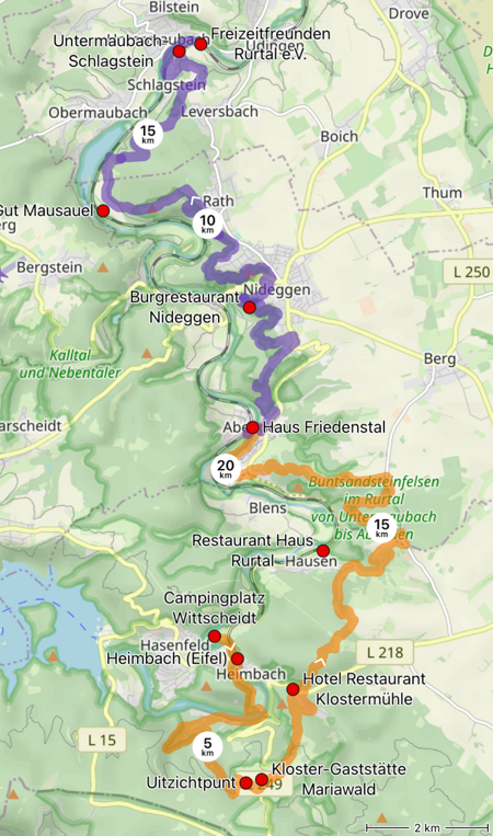 Wij pakken slechts een klein deel van zijn hele route; namelijk van de Rursee, het stuwmeer aan de noordkant van de Eifel naar het plaatsje Untermaubach, vlak bij Kreuzau, ten zuiden van Düren. Dit deel wordt gekenmerkt door de steile kliffen en bontzandsteenrotsen, waarbij mooie uitzichten horen. De oude stad Nideggen waar we langs komen bestaat uit bezienswaardige vakwerkhuizen, karakteristieke stadspoorten en een enorme burcht.
