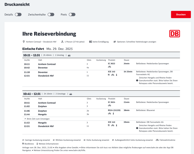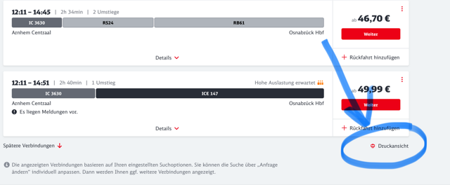 Nadat je op bahn.de tijdstip, begin- en eindstation hebt gekozen, kun je rechtsonder op het afdrukknopje drukken: