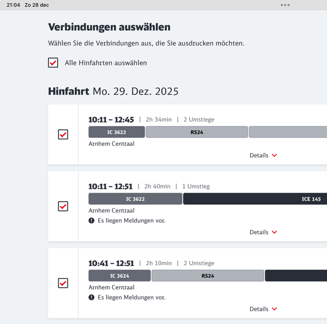 Dit zijn alle resultaten, maar veel fijner is om alleen de uitgekozen verbindingen te zien, met alle tussenhaltes, dat ziet er zo uit: