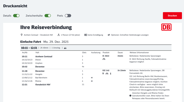 Helaas hebben de Duitsers hun site veranderd en is een routeplanner met goede afdrukfunctie nog met moeite te vinden, zodat ik op de linkspagina de informatie over treinplanners heb moeten aanpassen. [december 2025] De printfunctie is er weer, zie aan het einde.